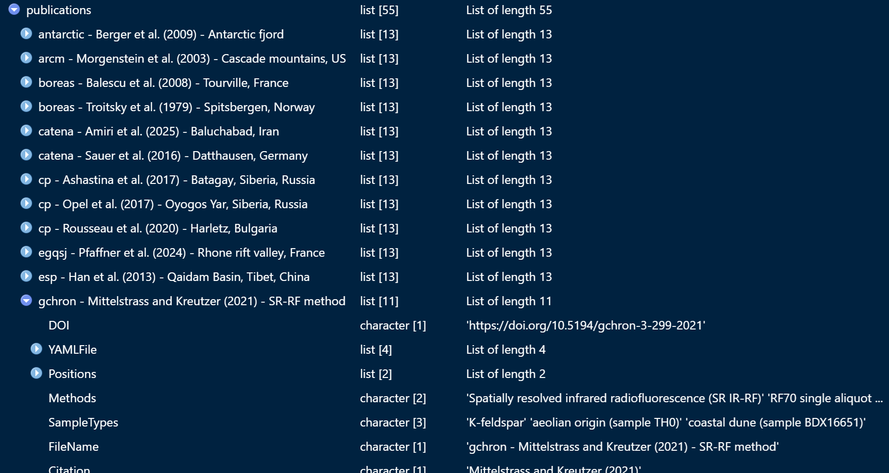 YAML database entries must be standardised; I created a template that you can download from the GitHub repository. I created a copy of the template for each publication and gave it a descriptive name, such as ‘gchron - Mittelstrass and Kreutzer (2021) - SR-RF method’. I manually added basic information, such as the DOI link, to the files, but most of the information was extracted by AI.